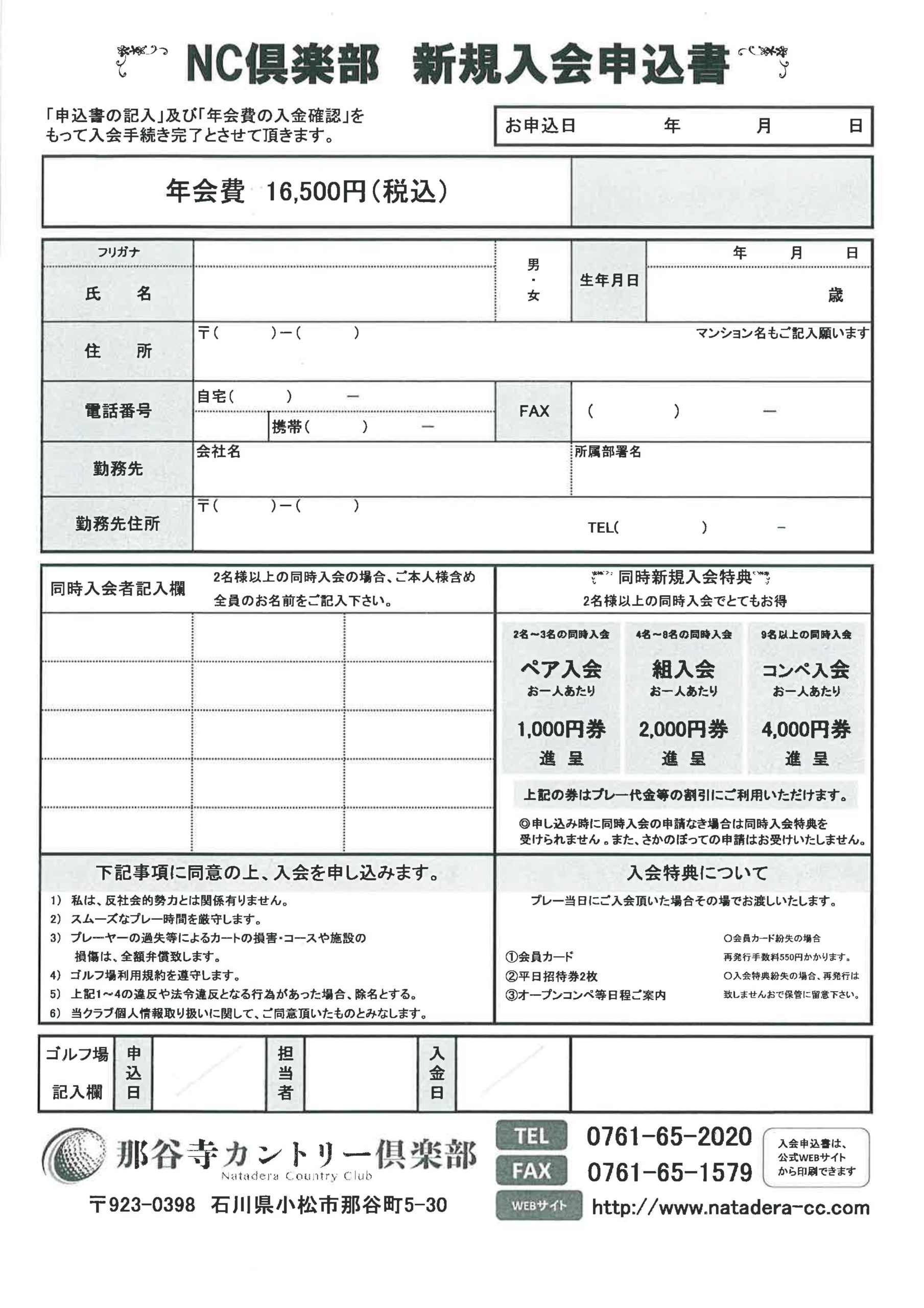 オープンコンペ・イベント オープンコンペ・イベントNatadera Event 2025年01月16日 平日年次会員 NC倶楽部2025年度入会キャンペーン実施中! 平日年次会員 NC倶楽部2025年度新規入会を募集しております! ご希望のお客様は下記申込書をダウンロードし必要事項をご記入の上、ご持参もしくはご郵送にて当倶楽部までお送りくださいますようお願い致します。 ※お申込書画像クリックをクリックするとPDFが表示されます。 ★NC倶楽部申込書ダウンロードはこちらからも可能です 皆様のご入会を心よりお待ち申し上げております。